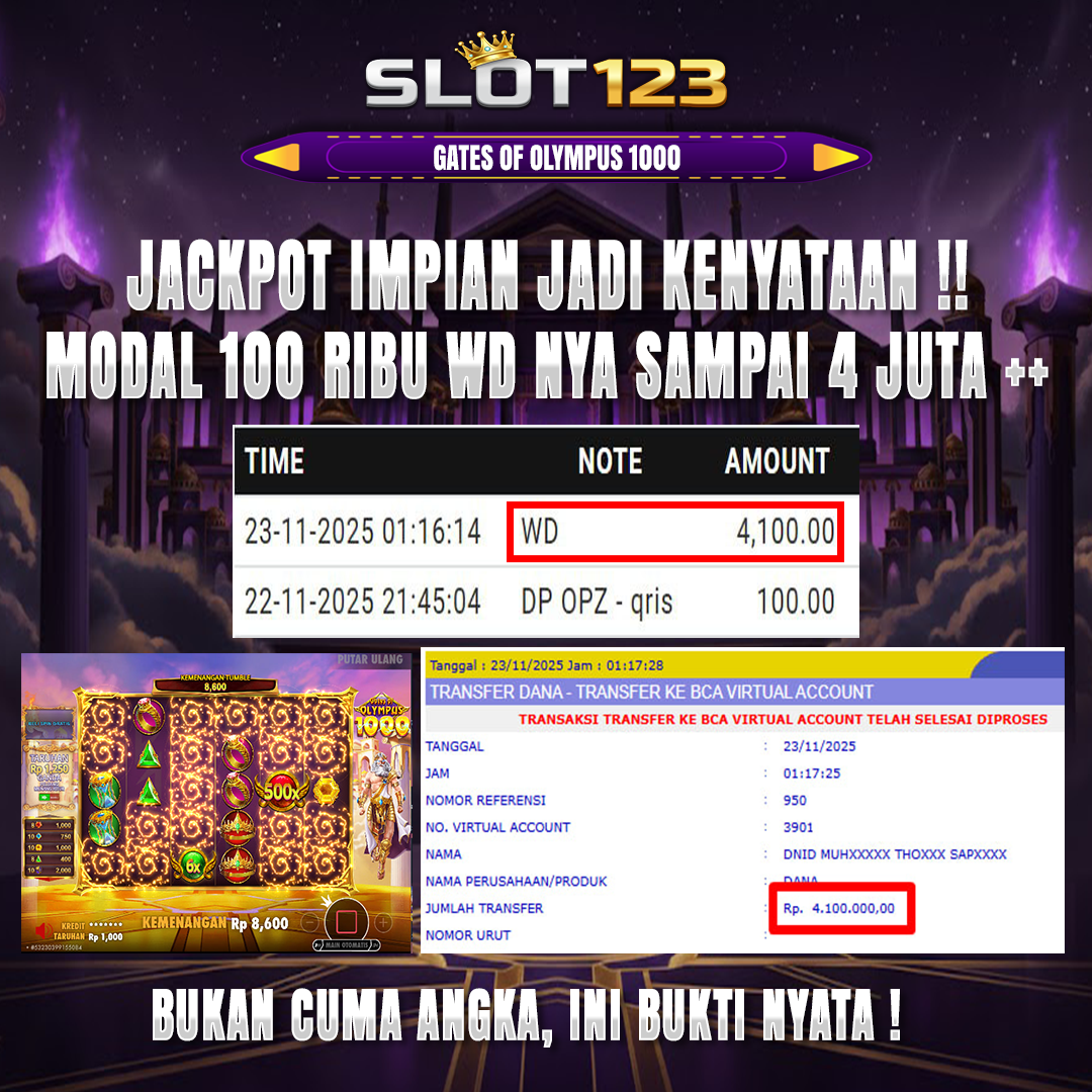 SLOT123 menghadirkan game jackpot vip yang di lengkapi fitur khusus new member hanya dengan modal deposit 100k dijamin akan withdraw 4,1 juta malam ini.